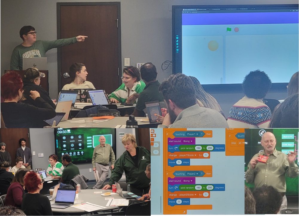 Dr. David Pugalee, Dr. Chris Glover, and Mrs. Alisa Wickliff also facilitated the session, demonstrating how Makey Makey kits and MicroBits can be connected to the Pong game to highlight real-world, hands-on applications of coding and engineering design. Participants explored how these tools can enhance classroom instruction and student engagement through creative problem-solving and interactivity.