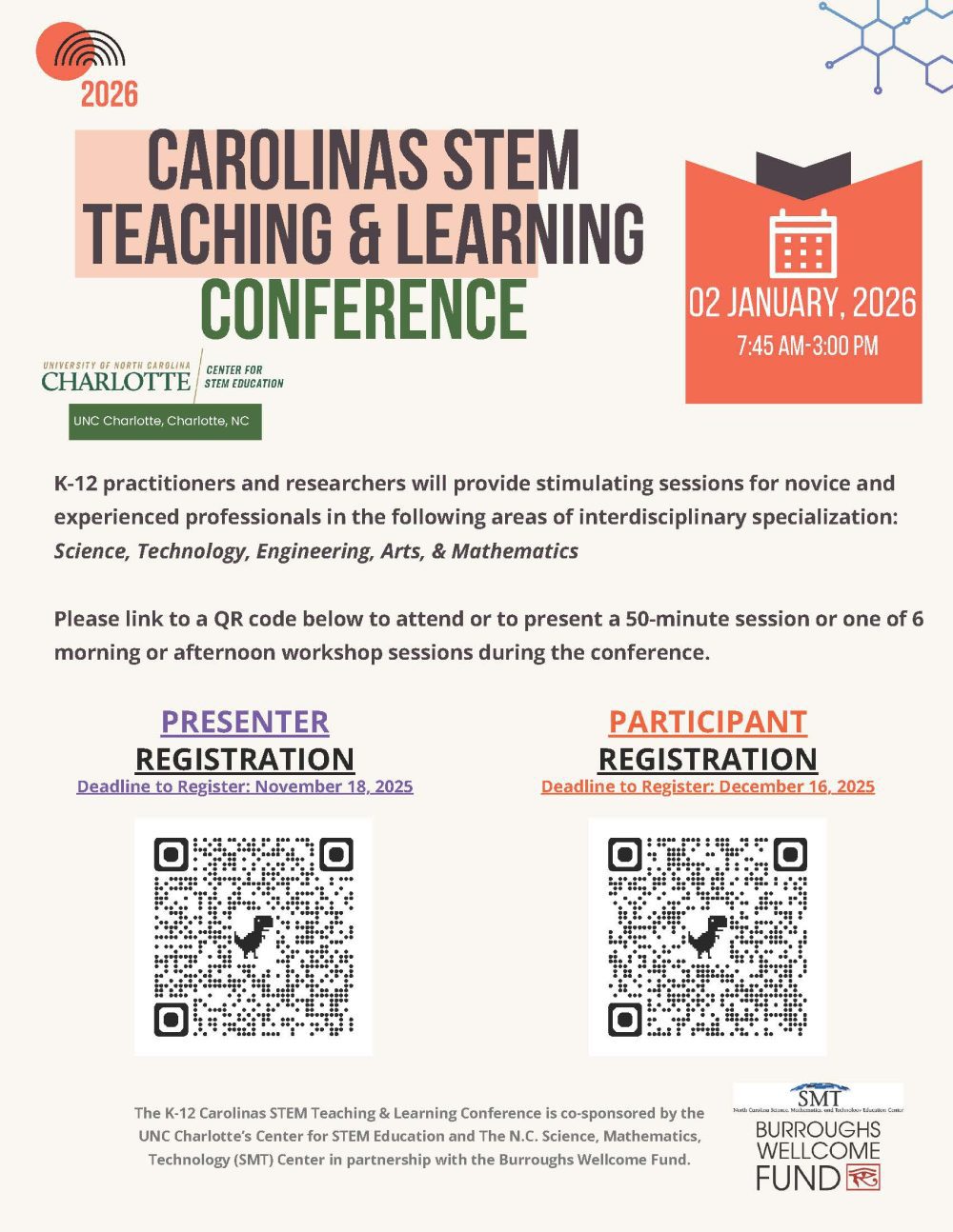 The Carolinas STEM Teaching and Learning Conference is an annual event, co-sponsored by the UNC Charlotte’s Center for STEM Education and The N.C. Science, Mathematics, Technology (SMT) Center, that brings K-12 educators together to share knowledge and resources for science, technology, engineering, and mathematics (STEM) education. The conference provides sessions, workshops, and opportunities for educators to learn new techniques and discover innovative ideas to use in their classrooms.