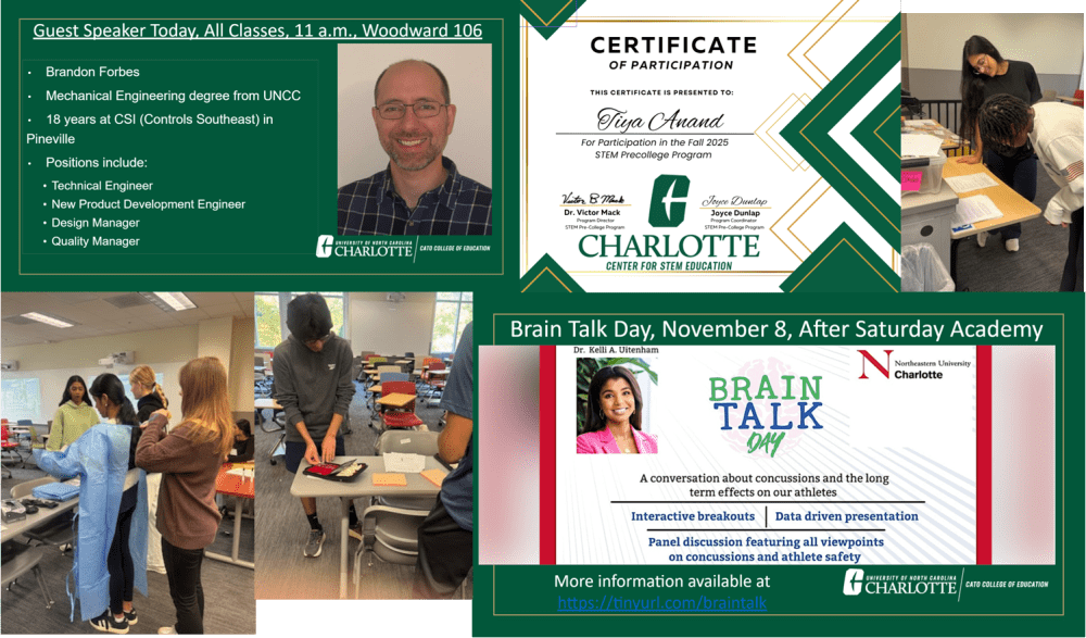 The STEM Pre-College Program had a great Saturday Academy on November 8, 2025 as all classes were held along with: a Parents Involved for Excellence Meeting; an Anatomage Table Demonstration by Joshua Harris, Graduate Student in Kinesiology, a presentation by Mr. Brandon Forbes, Mechanical Engineer and Pre-College Parent; and an awards ceremony highlighting outstanding student participation. Our next engagement is December 11 where we will conclude the Fall 2025 semester with at Virtual Thursday with a speaker to be announced. We are also proud to share that our Dr. Kelli Uitenham hosted a great Brain Talk Day at Northwestern University!
