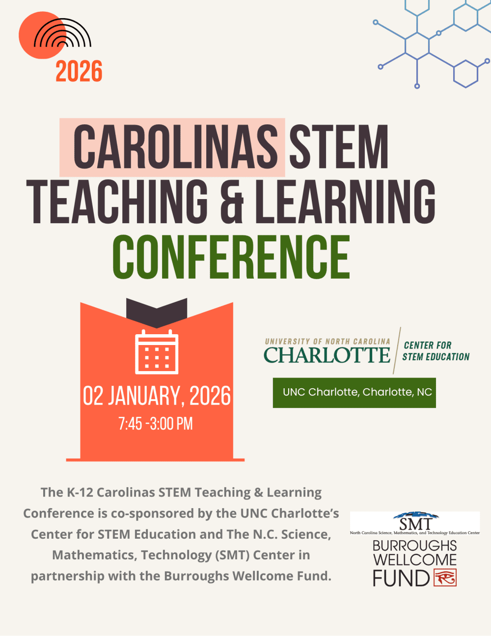 The Center for STEM Education is pleased to present the 2026 K-12 Carolinas STEM Teaching & Learning Conference on January 2, 2026 from 7:45 a.m. to 3:00 p.m. in the UNC Charlotte Mebane Hall (Cato College of Education).