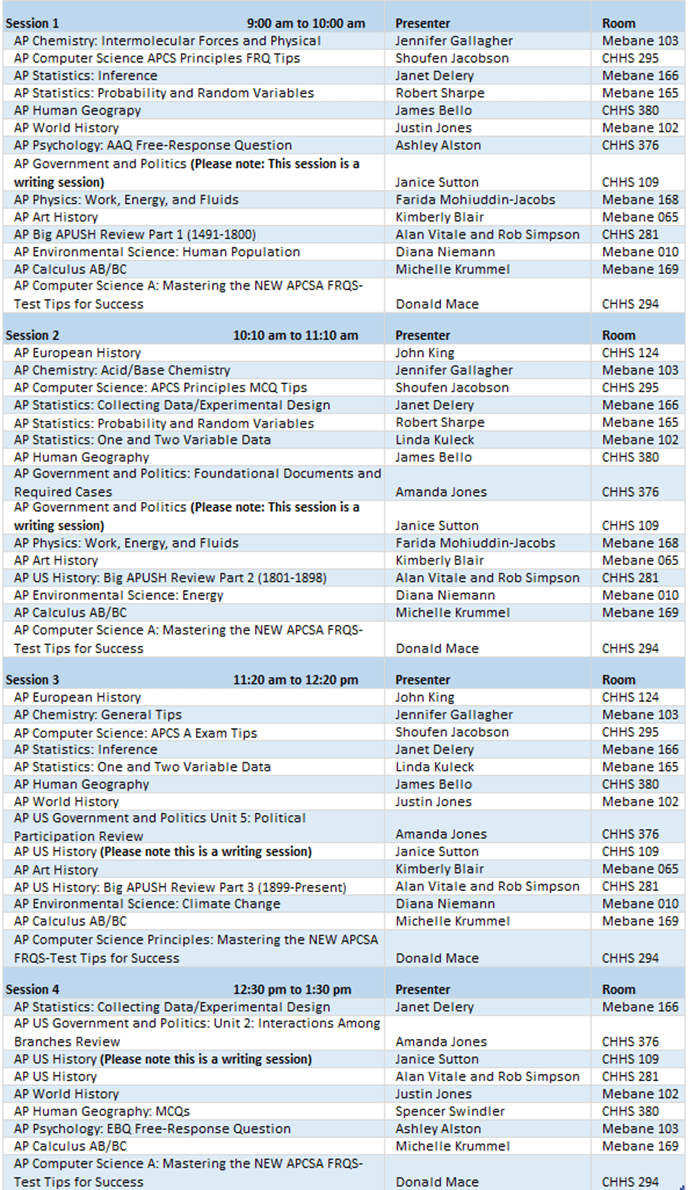 We are once again hosting AP Review Day, we will follow the same scheduling as last year. We will have four 1-hour sessions with a 10 minute break in between. For more information please reach out to: apsi@charlotte.edu